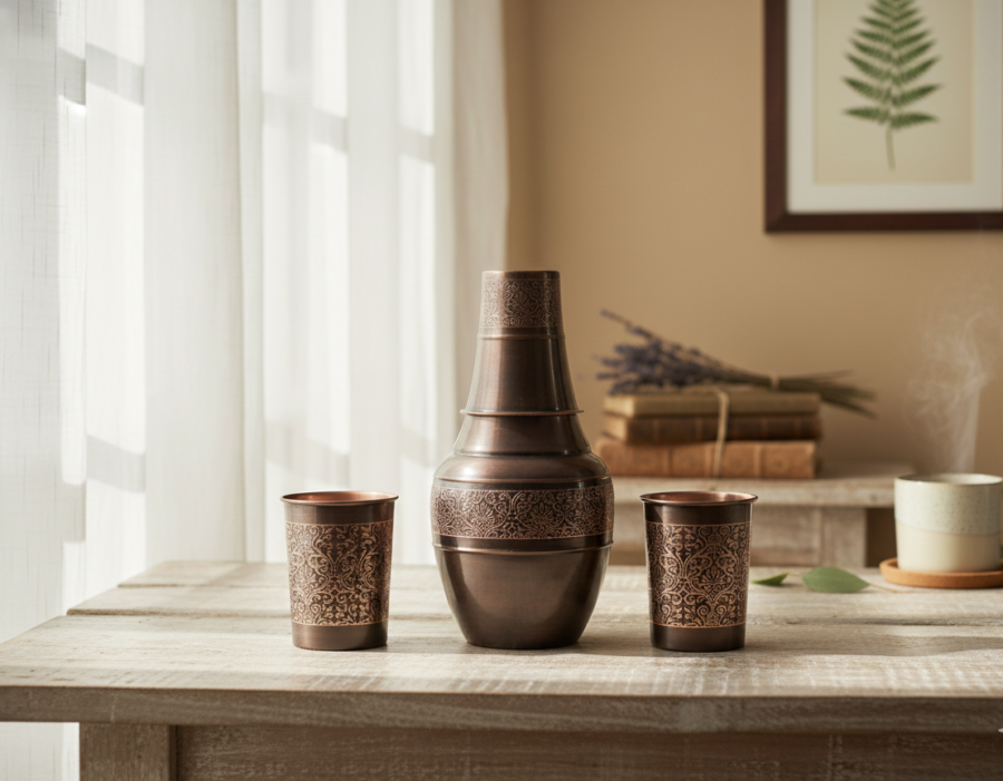 Crafted from pure copper, this decorative copper jar set is designed to not only quench your thirst but also provide holistic health benefits. The ancient Ayurvedic practice of drinking water from a copper vessel, known as “Tamra Jal”, helps balance the three doshas in your body (Vata, Pitta, and Kapha), promotes digestion and boosts immunity.