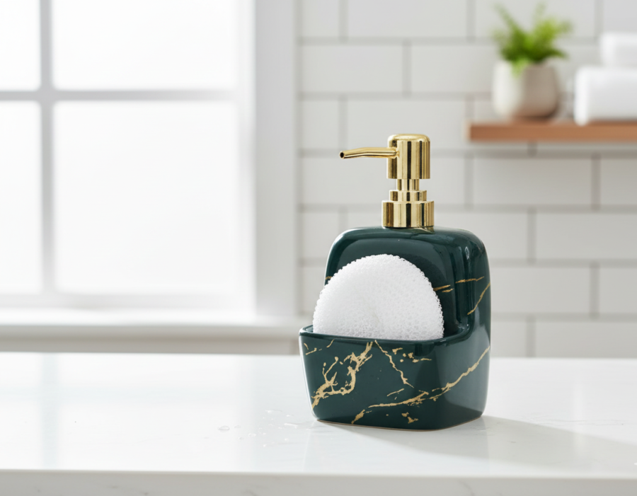Add a touch of luxury to your kitchen or bathroom sink with this elegant ceramic soap dispenser. Featuring a deep emerald green body with golden marble veining and a lustrous gold-finished pump, it brings both functionality and style. The built-in front compartment neatly holds the included scrubber, making this a perfect 2-in-1 solution for tidy countertops.