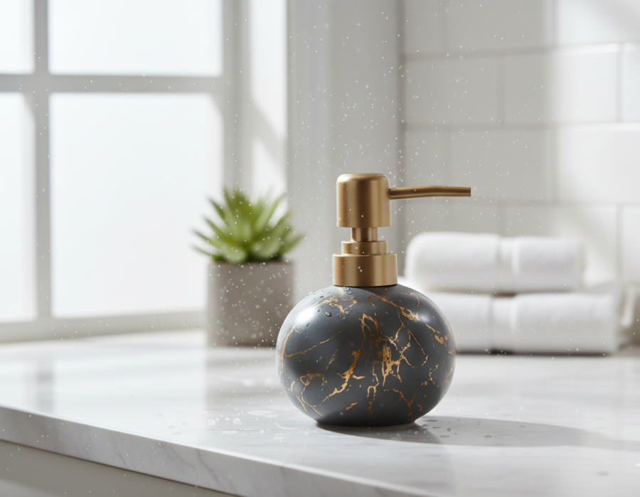 Ceramic Soap Dispenser – Grey Marble Look with Gold Accents