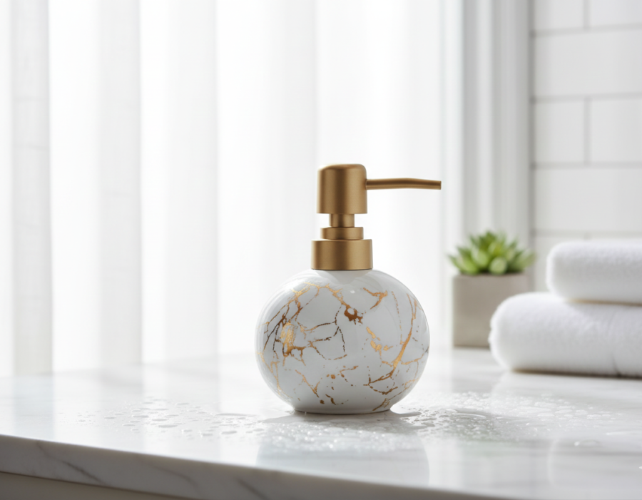 Ceramic Soap Dispenser – White Marble Look with Gold Pump