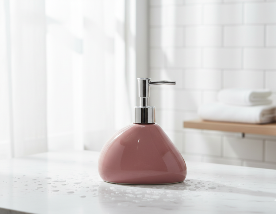 Bring elegance and warmth to your bathroom or kitchen with this rose pink ceramic soap dispenser. Its unique pebble-like shape and high-gloss ceramic finish create a modern yet cozy vibe. Topped with a sleek chrome pump, it effortlessly blends beauty with everyday function.