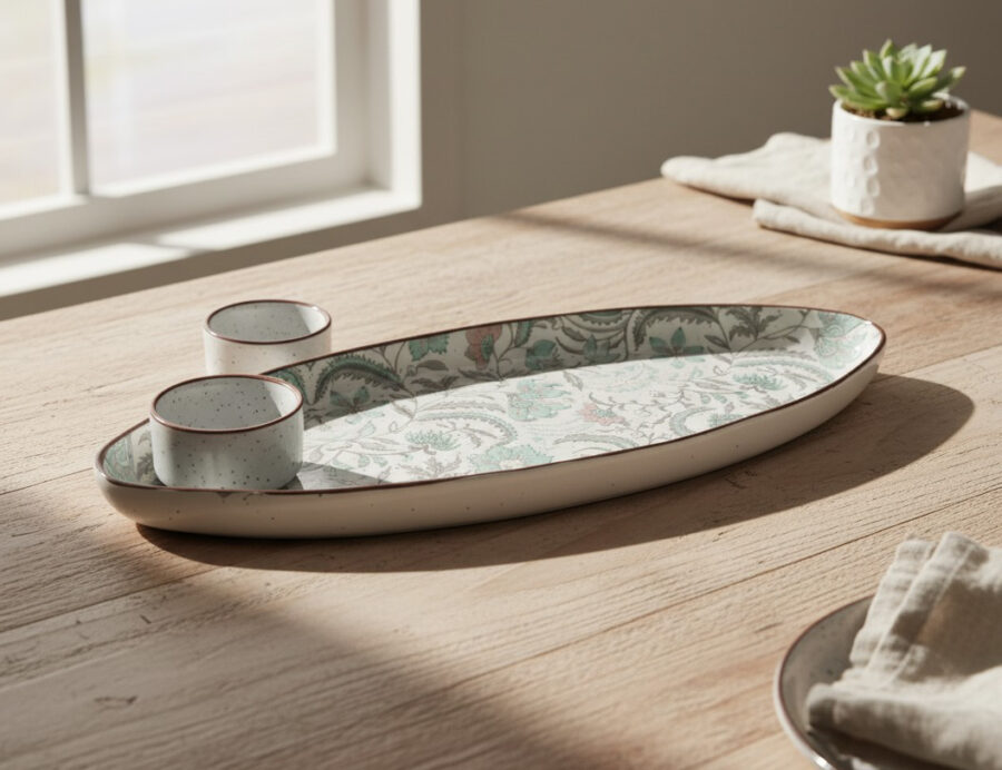 Each platter is made from high-quality ceramic, adorned with soothing prints that bring personality and charm to every spread — whether you’re entertaining guests or styling a cozy dinner.