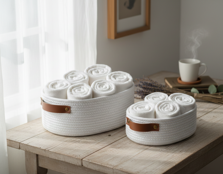 Elevate your organizing game with our stylish Cotton Rope Basket set. Made from 100% natural cotton rope, these baskets offer a soft yet sturdy design perfect for organizing your home with elegance. Perfect for placing your little accessories, these baskets are both Durable and lightweight. They are easy to carry from room to room, making these baskets both practical and chic.