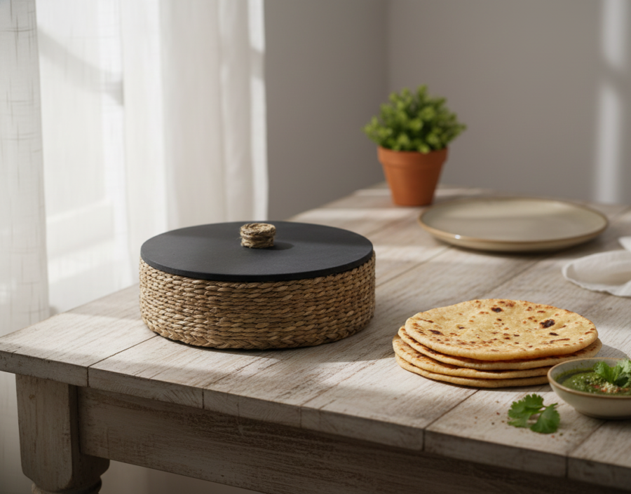 Elevate your dining experience with this eco-friendly and elegant sabai grass roti basket. Hand-woven by skilled artisans, this basket combines traditional craftsmanship with sustainable materials. Its natural texture and earthy tones add a rustic charm to your table setting. Perfect for keeping rotis, chapatis, or bread warm, this basket is lightweight, durable and easy to maintain.