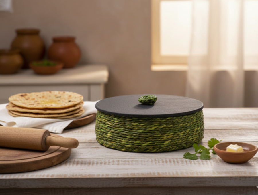 Elevate your dining experience with this eco-friendly and elegant sabai grass roti basket. Hand-woven by skilled artisans, this basket combines traditional craftsmanship with sustainable materials. Its natural texture and earthy tones add a rustic charm to your table setting. Perfect for keeping rotis, chapatis, or bread warm, this basket is lightweight, durable and easy to maintain.