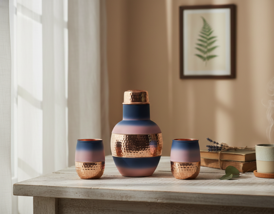 Crafted from pure copper, this decorative copper jar set is designed to not only quench your thirst but also provide holistic health benefits. The ancient Ayurvedic practice of drinking water from a copper vessel, known as “Tamra Jal”, helps balance the three doshas in your body (Vata, Pitta, and Kapha), promotes digestion and boosts immunity.