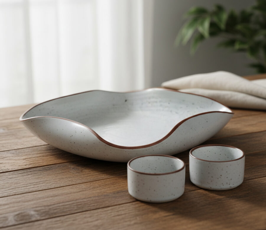 The platter features a unique organic wave shape with a rustic brown rim, adding a touch of sophistication to any table setting. Paired with two matching dip bowls, it offers the perfect balance of style and practicality – ideal for serving sauces, chutneys, or dips alongside your favorite dishes.